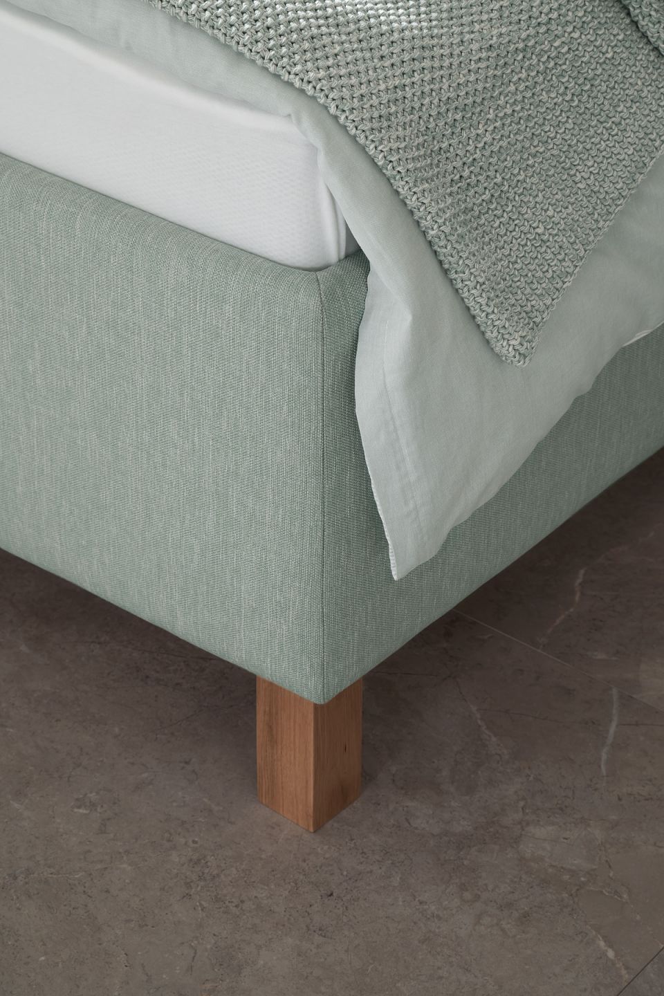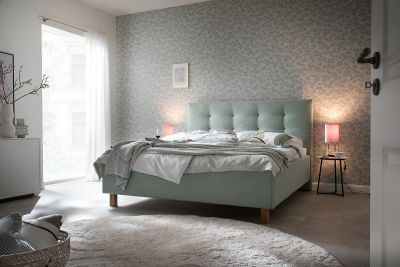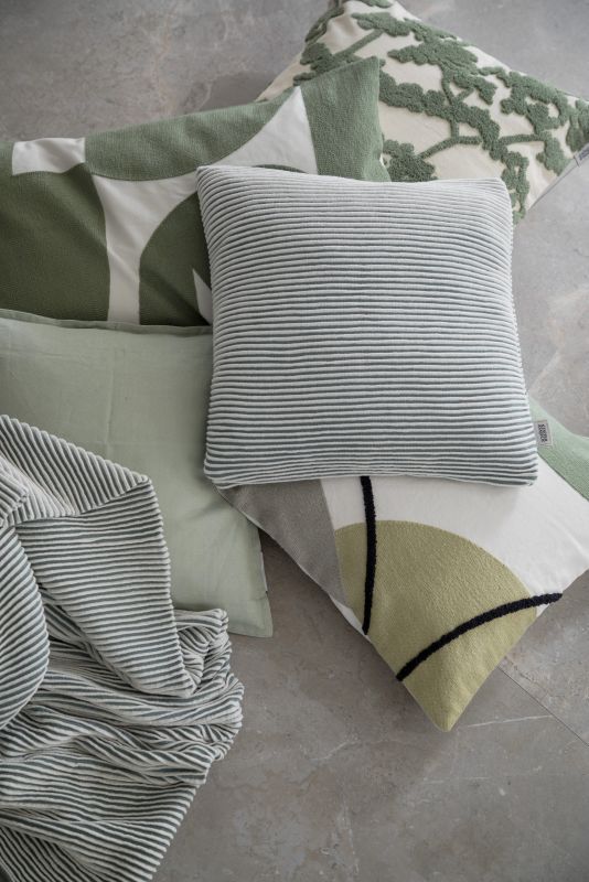 Bläuliche Grüntöne mit einem warmen Weiß und strukturiertem Grau wirken ausgleichend und beruhigend – doch keineswegs leblos. Diese Farb- und Materialkombination aus Steinoptik und weichen Textilien ist eine gelungene Paarung.